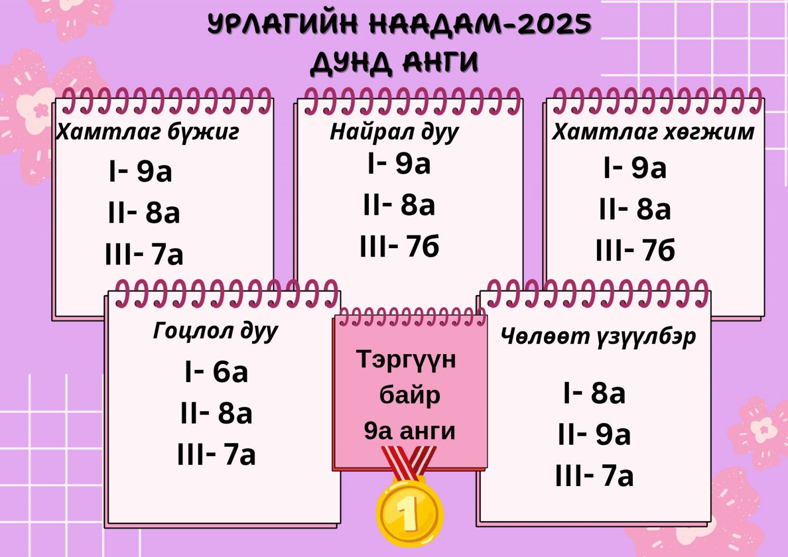 Сурагчдын авьяас чадварыг нээн хөгжүүлэх, анги хамт олныг эв нэгдэлтэй болгох, чөлөөт цагаа зөв боловсон өнгөрүүлэх зорилготой уг тэмцээнд авьяас чадвар авхаалж самбаагаа дайчлан оролцсон нийт сурагчдадаа болон тэргүүлсэн анги хамт олонд халуун баяр хүргэж урлаг сурлагын өндөр амжилт хүсье.