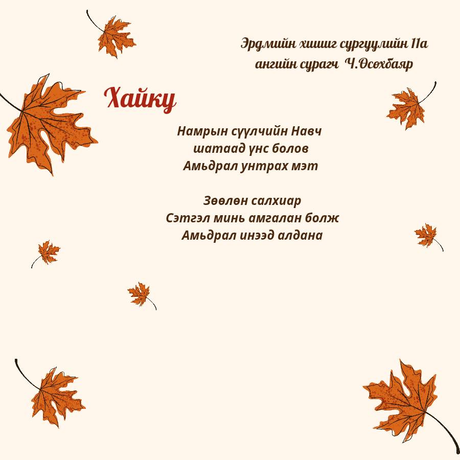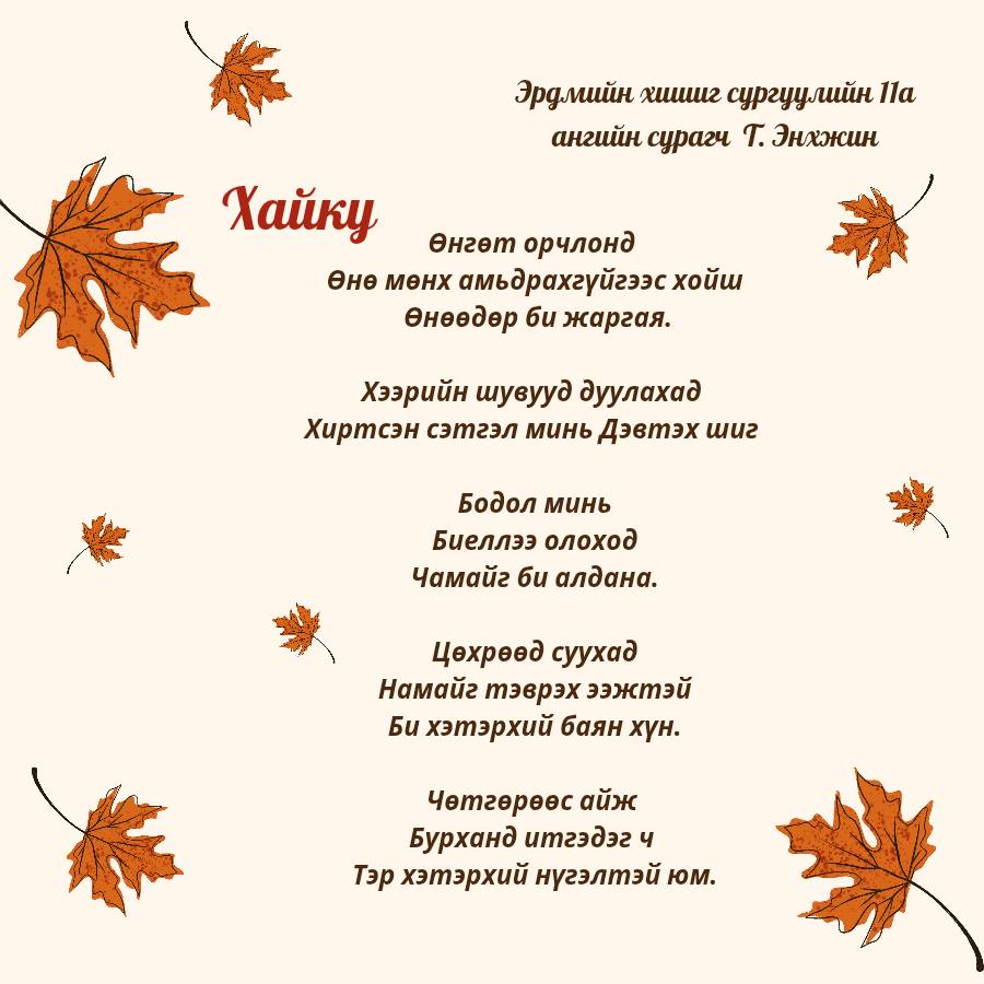 11-р ангийн Уран зохиолын хичээл "Хайку яруу найргийн төрөл зүйлийг танин мэдэж дуурайн зохиох" сэдэвт хичээлийн хүрээнд 11а ангийн сурагчид маань Намар сэдвийн хүрээнд дараах Хайку шүлгийг зохиож өөрийн мэдрэмж сэтгэгдэл, үзэл бодлоо ийнхүү шүлгээр дамжуулан илэрхийлэн бичжээ.
