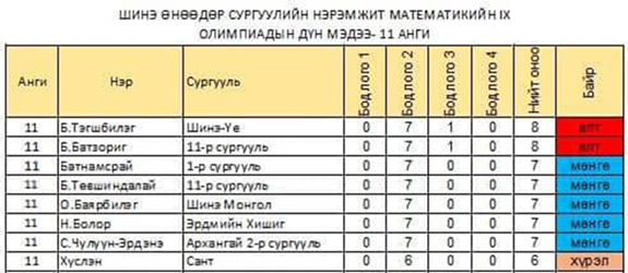 Шинэ Өнөөдөр сургуулийн нэрэмжит математикийн олимпиадад амжилттай оролцож нийт дүнгээрээ 7-р байранд жагслаа. МӨНГӨН медаль хүртсэн 11а ангийн сурагч Н.Болор
