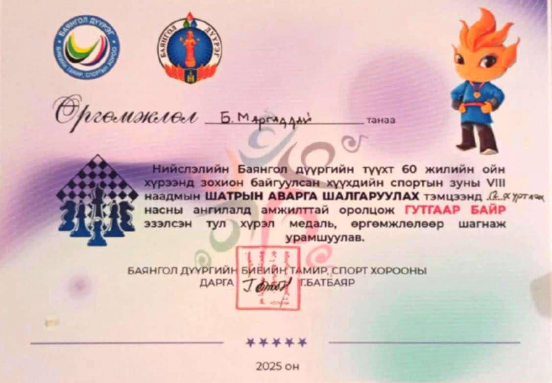 БГД-ийн түүхт 60 жилийн ойг тохиолдуулан зохион байгуулсан хүүхдийн спортын зуны VIII наадмын ШАТРЫН төрөлд 3а ангийн сурагч Б.Маргаддай амжилттай оролцож III байр эзэллээ.