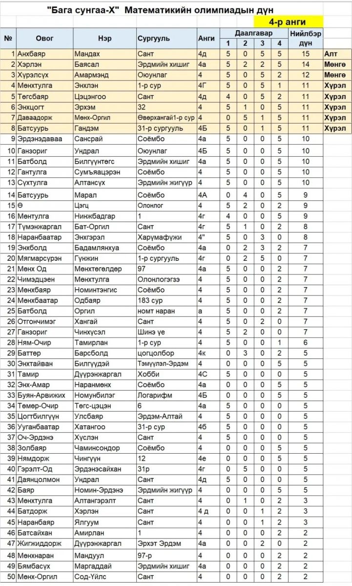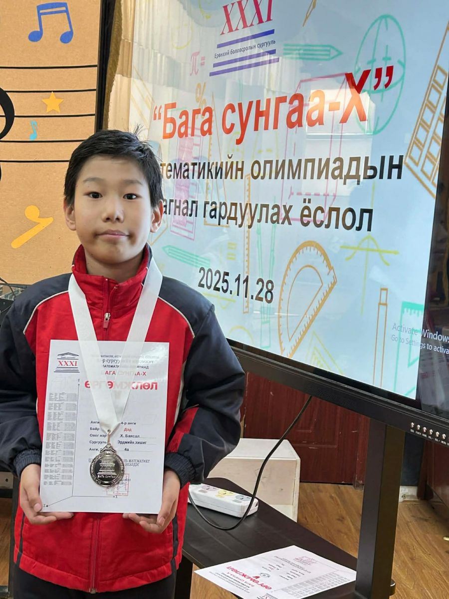 "Бага сунгаа-X" Математикийн олимпиадын 4-р ангийн төрөлд сурагч 4а ангийн Х.Баясал амжилттай оролцож мөнгөн медаль хүртлээ. Нийт амжилттай оролцсон сурагчдадаа болон бэлтгэсэн багшдаа баяр хүргэж амжилт хүсье.